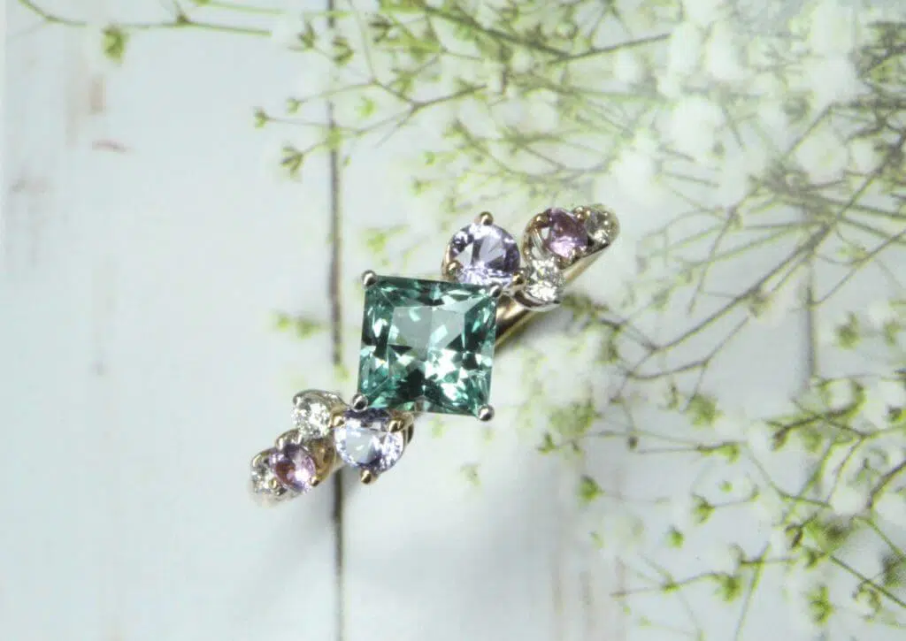 One of the joys of choosing a green tourmaline for your engagement ring is the ability to custom it to your taste. At GIOIA Fine Jewellery, we are always here to listen and understand your design inspiration. Whether you prefer a classic solitaire setting or something more elaborate, green tourmaline pairs beautifully with other cluster coloured gemstones, creating a truly personalised piece. For example, a princess-cut green tourmaline can be combined with pink sapphires or orangish-pink spinels for a vibrant and harmonious design that turns heads.