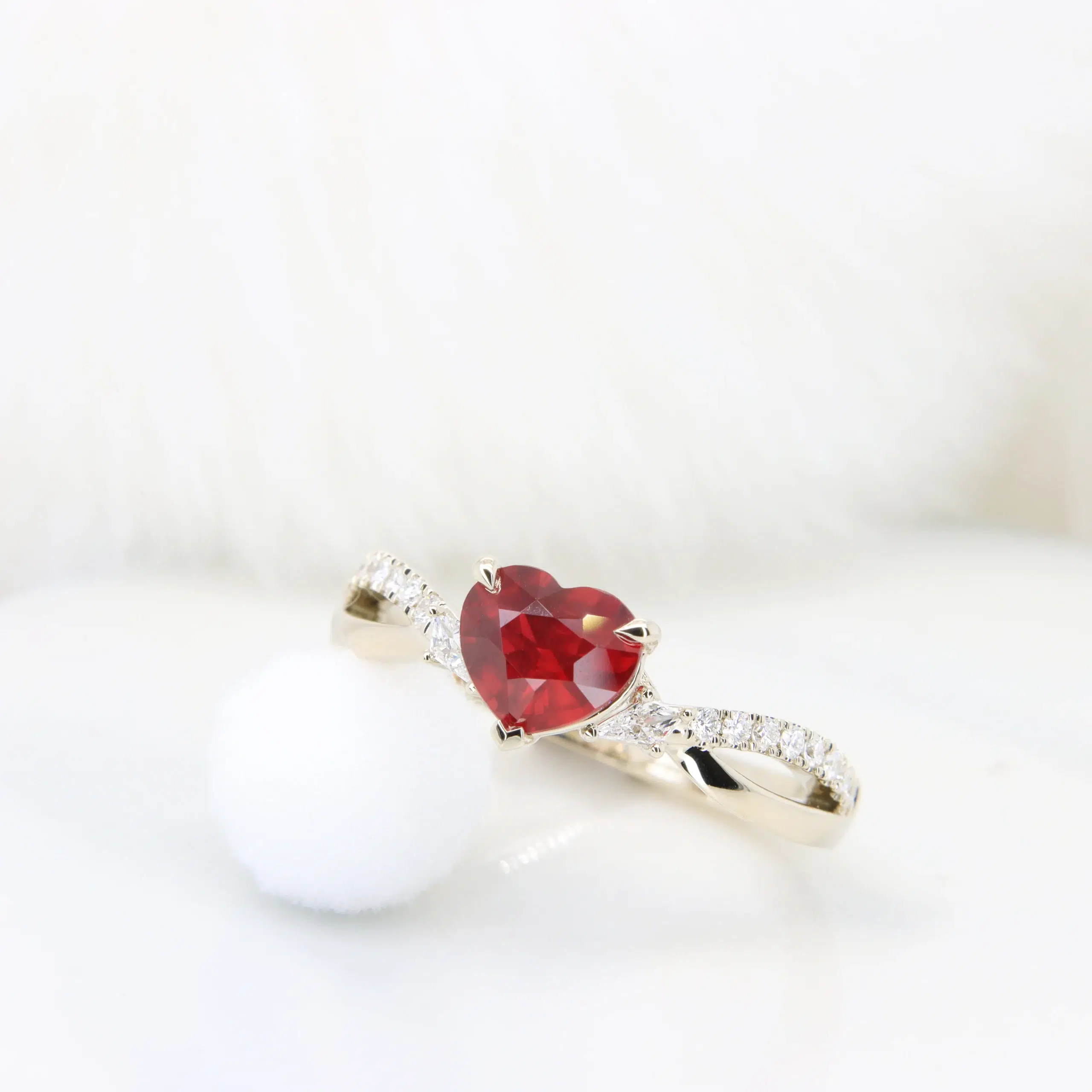 This minimalist approach allows maximum light to enter the ruby, enhancing its red glow, while keeping the romantic silhouette sharp and visible from every angle.