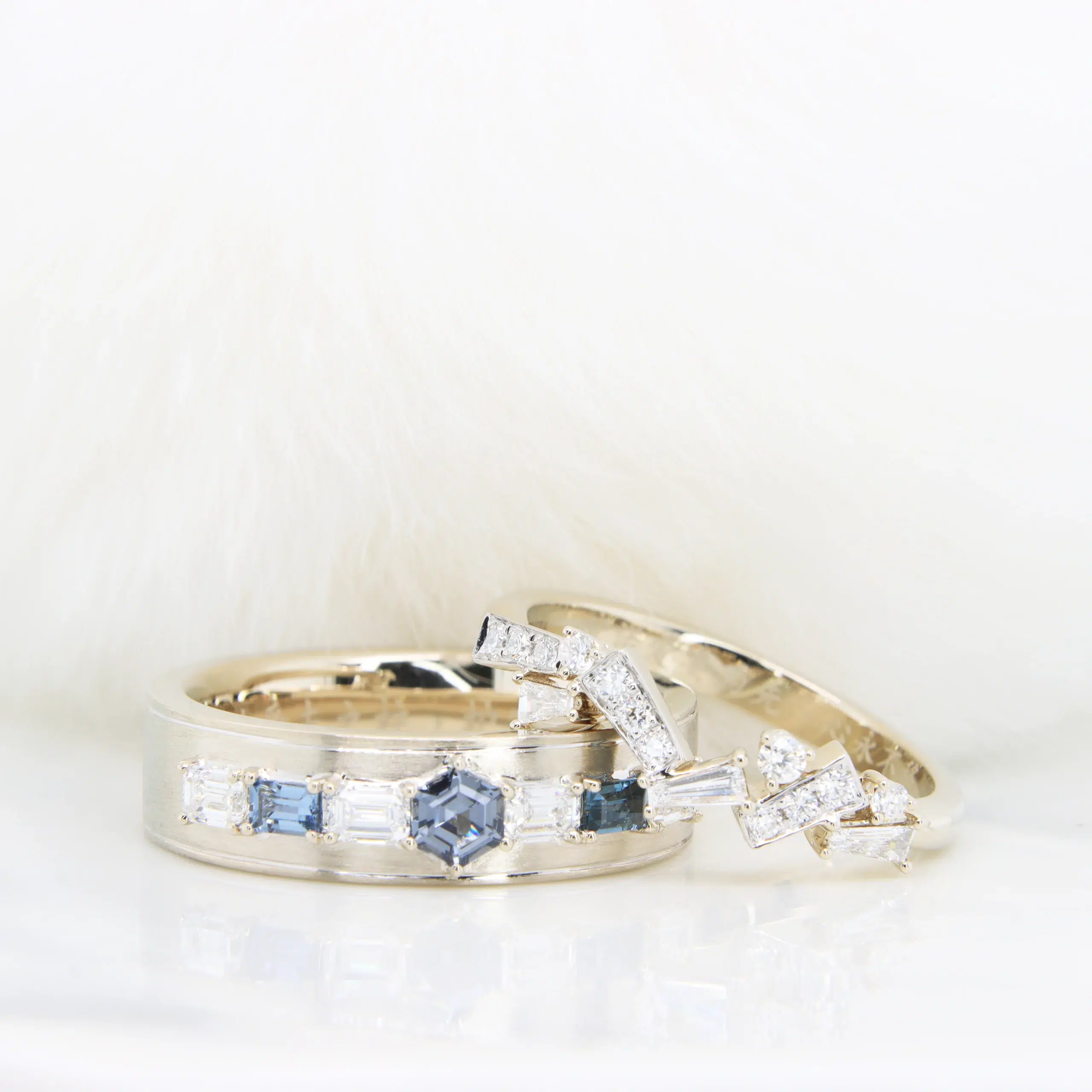 Wedding Rings customised with teal coloured shade of spinel and flora detailing design for the ladies wedding ring. Crafted with exception craftsmanship, personalised to both style is a unique bond of love. Wedding Ring customised by GIOIA Fine Jewellery